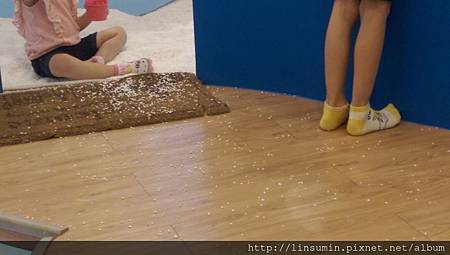我回頭跟那一桌子的媽媽說:「服務人員要清理砂池了喔,」,然後又不怕死的加了一句:「你們孩子把砂都灑出來了。」