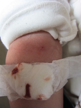 檢驗血液酸鹼值抽的不是一般的靜脈血,而是肉眼看不到,需要經驗觸摸憑感覺抽取的動脈血,我家弟弟血管又細又小,之前TPN需要定期抽檢肝腎功能時,常常就是我跟把拔加上兩個大人才有辦法壓著他抽,因為怕他亂動抽血不易,大人們的力道常不自覺的過大,所以抽完血後,弟弟的小手也常淤青好幾天,這還不過是靜脈;而這次抽的是動脈血,針頭是直挺挺的往孩子手臂扎,孩子一哭,動脈就跑,當媽媽的我只能眼睜睜的看著針頭在孩子手臂裡左挑右撥,看著大人往孩子身上壓,看著昏迷的孩子因為劇痛驚醒狂哭;忍住眼淚的我,只能在孩子的耳邊告訴他:「你是世界上最勇敢的孩子,你真的好棒好棒。」