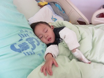 點滴注射時哭鬧了一場,隨即又陷入昏迷的寶貝