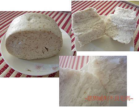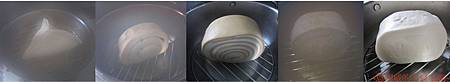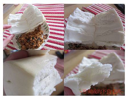 好啦,最後挑戰來了,吃了前面帶著口味又美味十足的饅頭,回頭要來嚐嚐最~~~~根本的味道了------嗆麵白饅頭!ㄚ敏很不識相的盛了一大盤的肉鬆,因為怕有了之前的美味激盪,這白饅頭會不敵群雄敗下陣來,當然要幫它找來肉鬆當應援團囉(明明就是自己怕白饅頭沒味道)!對於蒸好的饅頭,我已經習慣性的想要看看它的斷面,這嗆麵白鰻頭的內涵還真有層次,跟我害怕的乾燥空洞很不一樣,撕開像頁岩一樣的層次,入眼的卻像棉花糖一樣的鬆軟。嚐了一口,發現自己的擔心真多餘,這五種口味的饅頭個個都有老麵當靠山,更何況整顆都是老麵發酵的白饅頭。等到整顆饅頭都快嗑光了,才發現滿滿一盤的肉鬆忘了加,試著加上肉鬆吃上一口~~~~~~說真的,這饅頭味道實在扎實,加了肉鬆反而累贅。